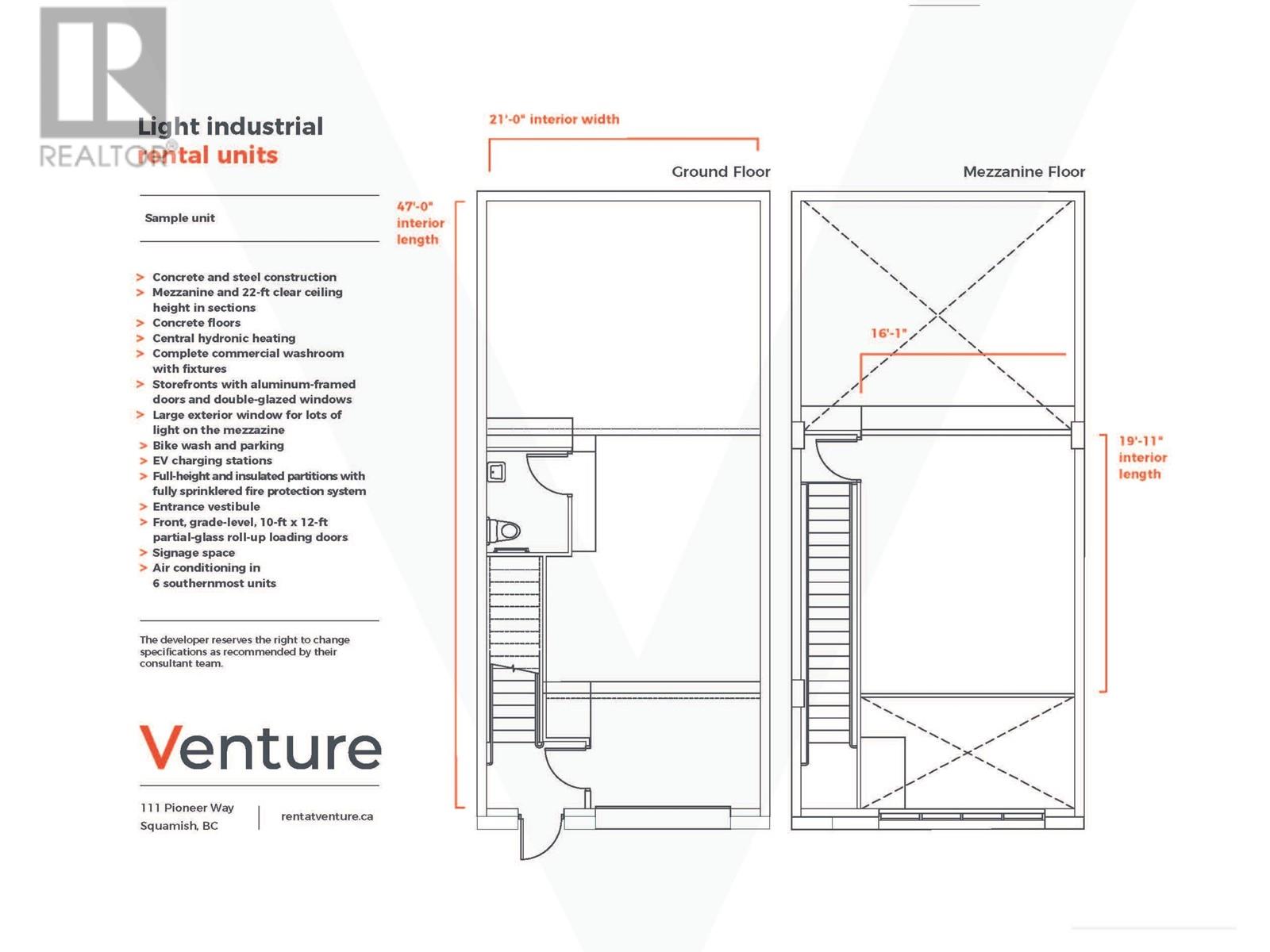 Venture Squamish is a new light industrial/mixed-use complex in a central location in the Squamish Business Park offering industrial/office units from 1209 to 5628 square feet. High quality concrete construction, excellent transportation logistics, excellent neighbourhood anchors and a functional base unit demise make for a great opportunity to relocate or start your business in this tight light industrial market. Phase 1 – $19.00 – $21.00 base rent. Free rent until 2025!! Call for more information (id:59197)