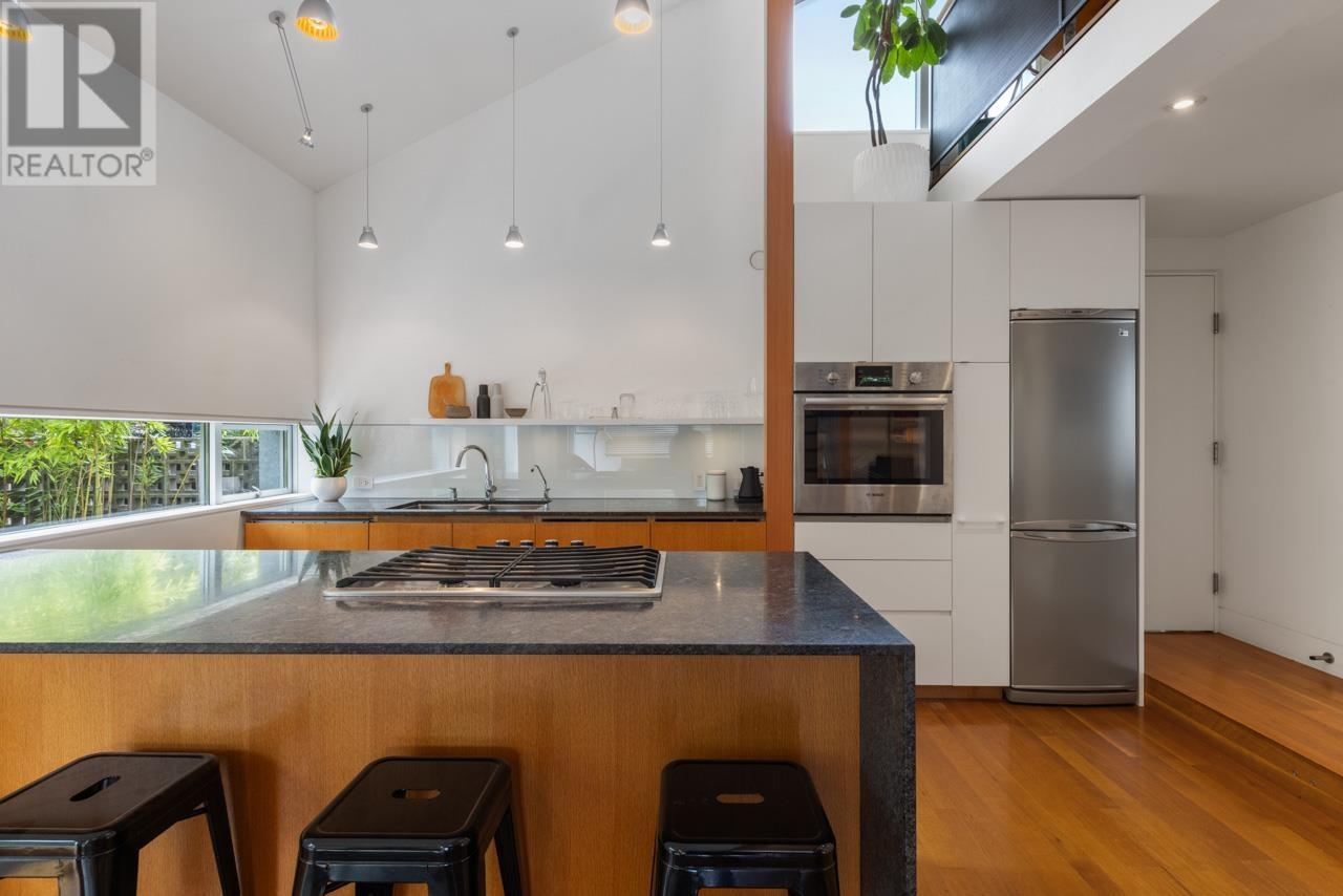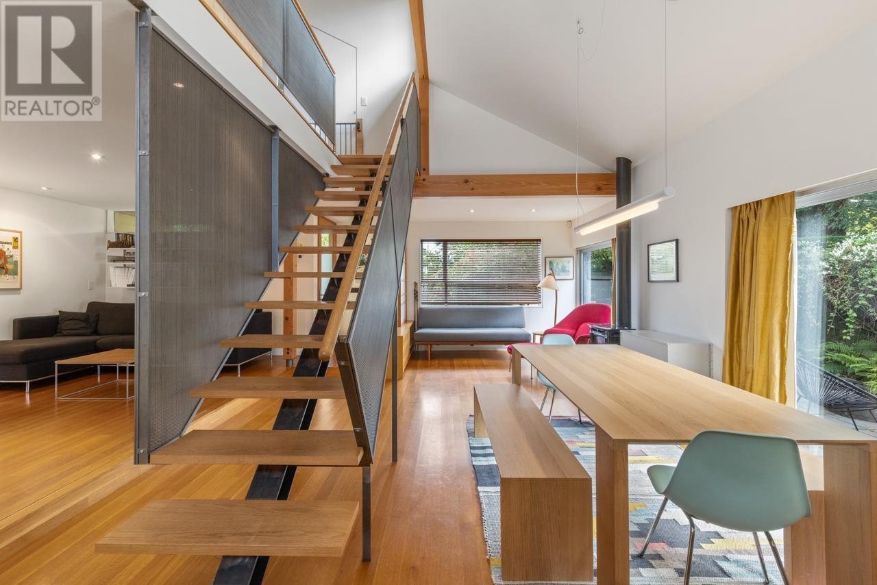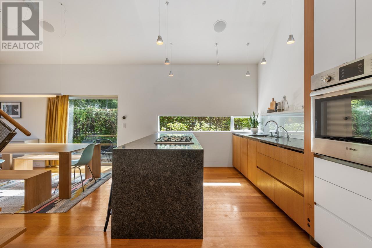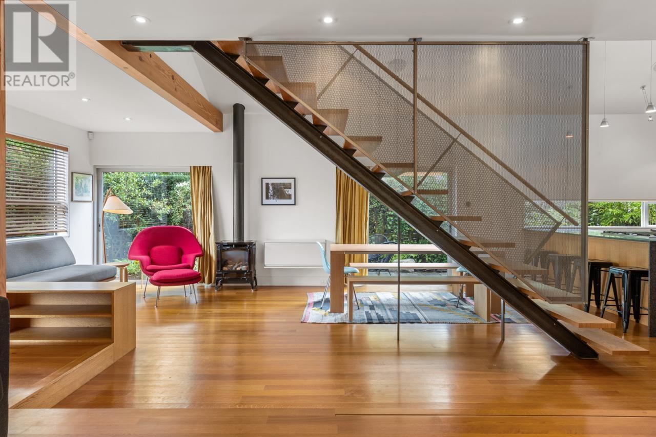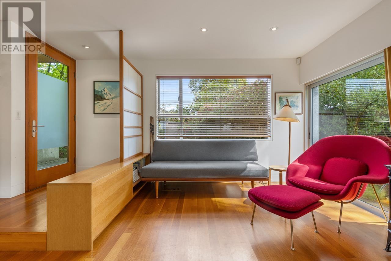 On a quiet corner of a traffic calmed block you will find this marvelous example of modern minimalist design. Completely reimagined to a very high standard, this home is truly one of a kind. Efficient open floorplan with large principal spaces, built-in storage, soaring ceilings, oversized windows & sliders for seamless indoor/outdoor flow. An entertainers dream! The kitchen has a large island with bar seating, gas cooktop & new wall-oven. The media room is easily converted to a great third bedroom. The spa-like bathroom with separate tub & shower completes this level. Up the floating stairs you’ll find two sleeping areas with loads of storage, one with 2 pc ensuite. Attached garage, radiant heat, gas fireplace, Lutron lighting, motorized blinds, lovely yard. Must be seen to be fully appreciated! (id:59197)