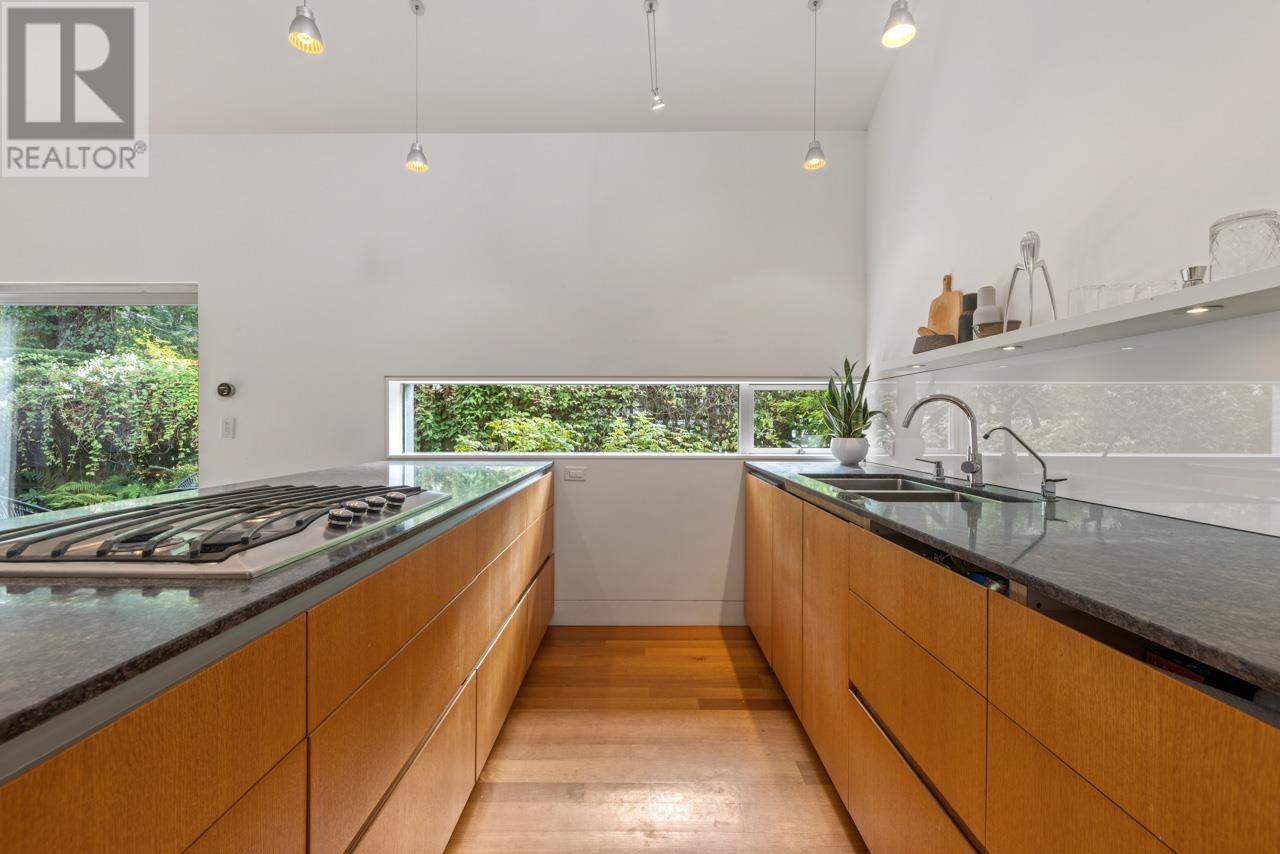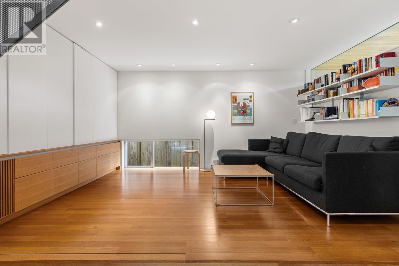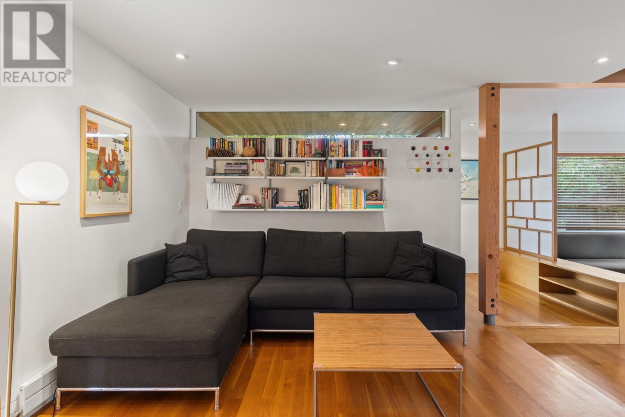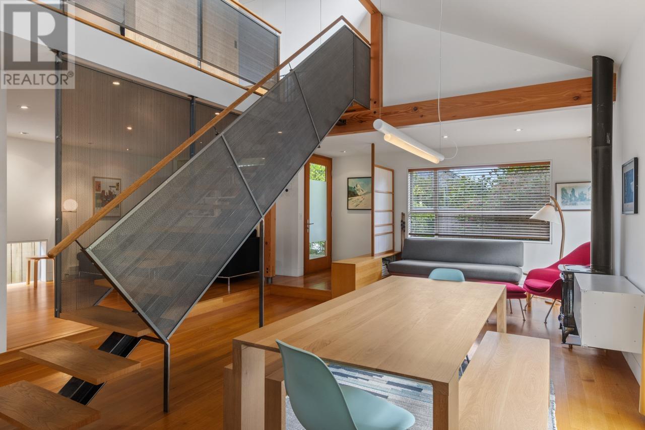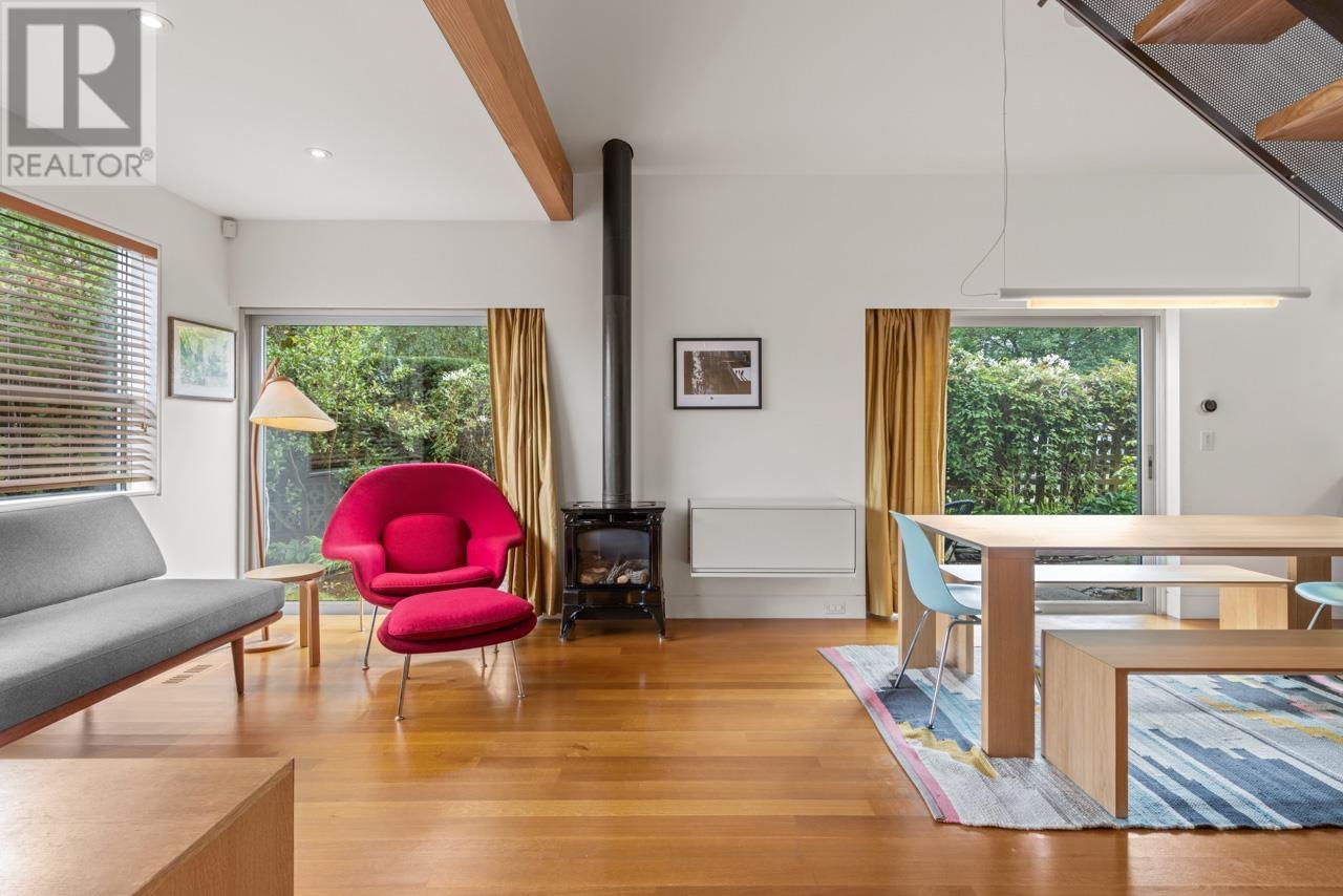 On a quiet corner of a traffic calmed block you will find this marvelous example of modern minimalist design. Completely reimagined to a very high standard, this home is truly one of a kind. Efficient open floorplan with large principal spaces, built-in storage, soaring ceilings, oversized windows & sliders for seamless indoor/outdoor flow. An entertainers dream! The kitchen has a large island with bar seating, gas cooktop & new wall-oven. The media room is easily converted to a great third bedroom. The spa-like bathroom with separate tub & shower completes this level. Up the floating stairs you’ll find two sleeping areas with loads of storage, one with 2 pc ensuite. Attached garage, radiant heat, gas fireplace, Lutron lighting, motorized blinds, lovely yard. Must be seen to be fully appreciated! (id:59197)